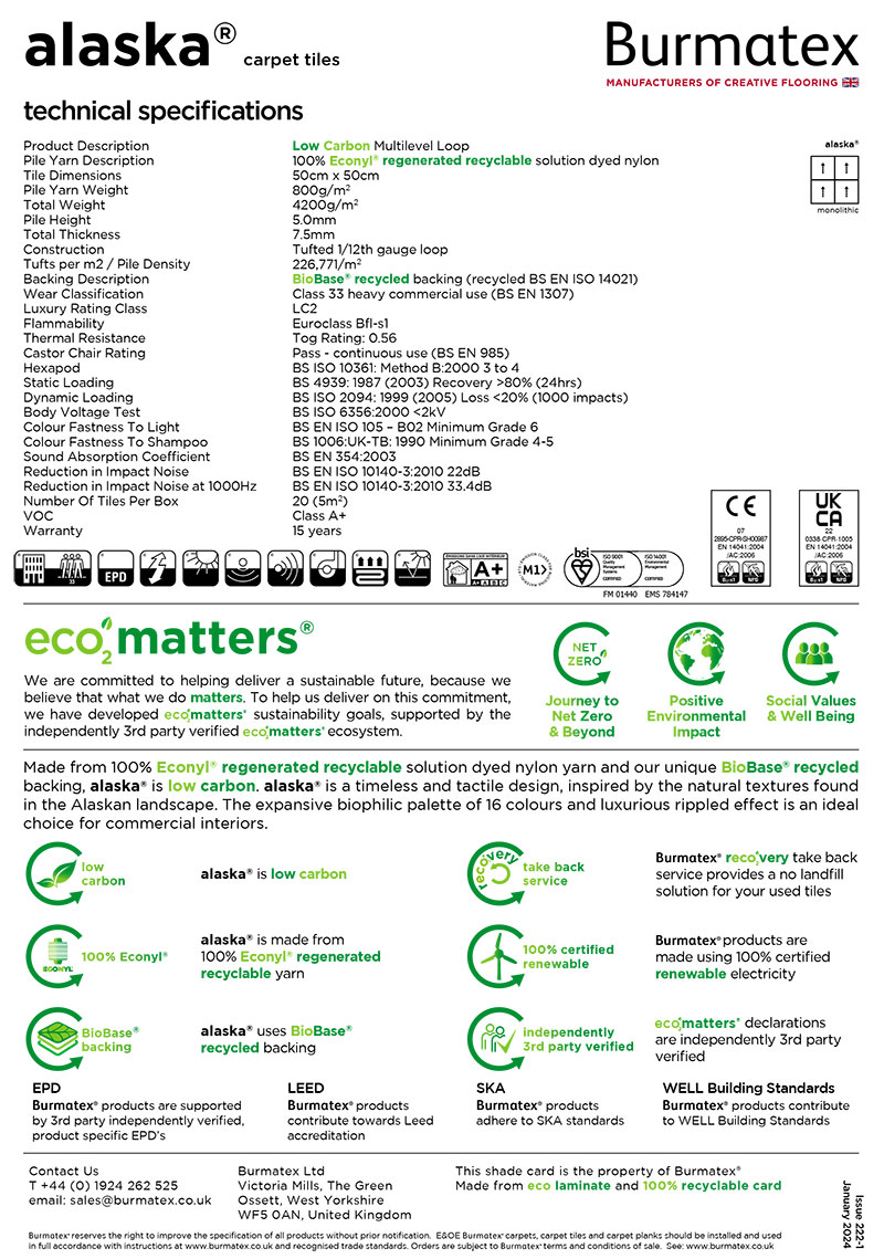 Płytki dywanowe Burmatex Alaska to trwała wykładzina modułowa przeznaczona do intensywnie użytkowanych przestrzeni komercyjnych, takich jak biura, hotele czy obiekty publiczne. Kolekcja wyróżnia się subtelną strukturą inspirowaną naturalnymi krajobrazami oraz paletą 16 kolorów, która pozwala tworzyć nowoczesne aranżacje wnętrz. Wykonane z regenerowanego nylonu Econyl®, płytki zapewniają wysoką odporność na zużycie, trwałość kolorów oraz łatwe utrzymanie czystości. Format 50 × 50 cm ułatwia montaż i ewentualną wymianę pojedynczych elementów, a redukcja hałasu do 22 dB poprawia komfort akustyczny pomieszczeń.