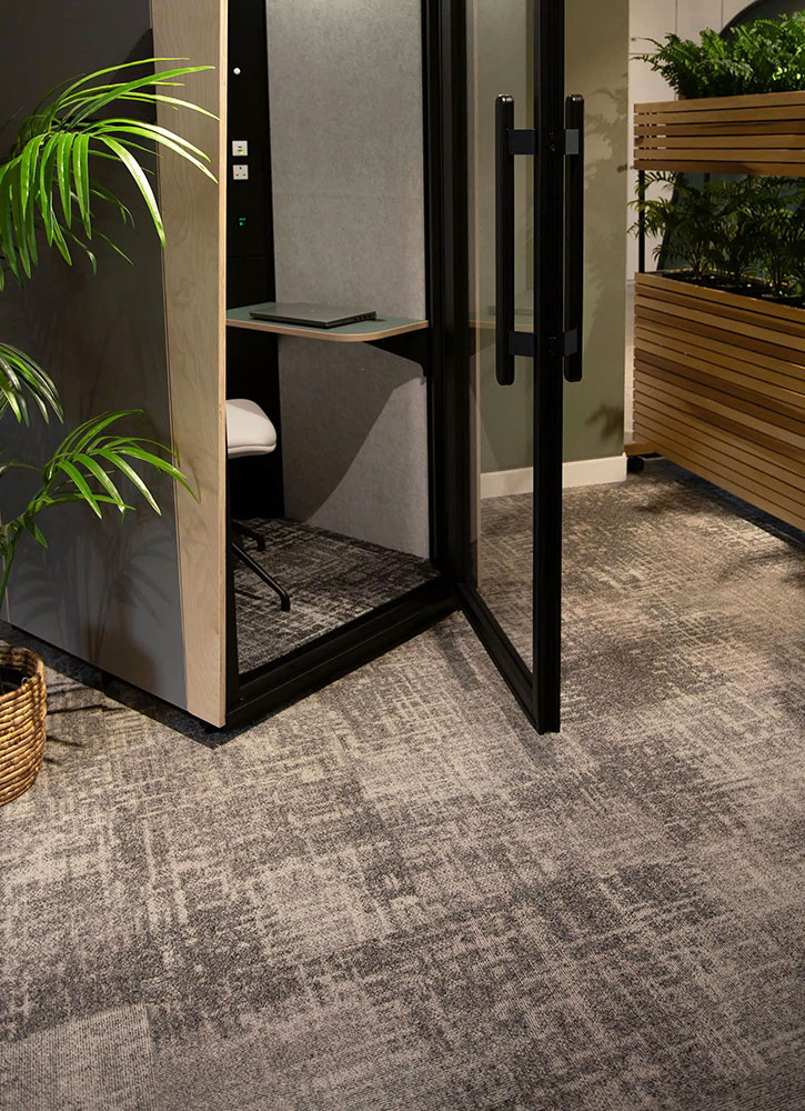 Wyraźna, „mięsista” struktura płytek sprawia, że podłoga zyskuje luksusowy, tekstylny charakter i doskonale komponuje się z nowoczesnym drewnem, betonem architektonicznym czy metalem. Kolekcja umożliwia również tworzenie stref i subtelnych przejść kolorystycznych w dużych przestrzeniach biurowych.