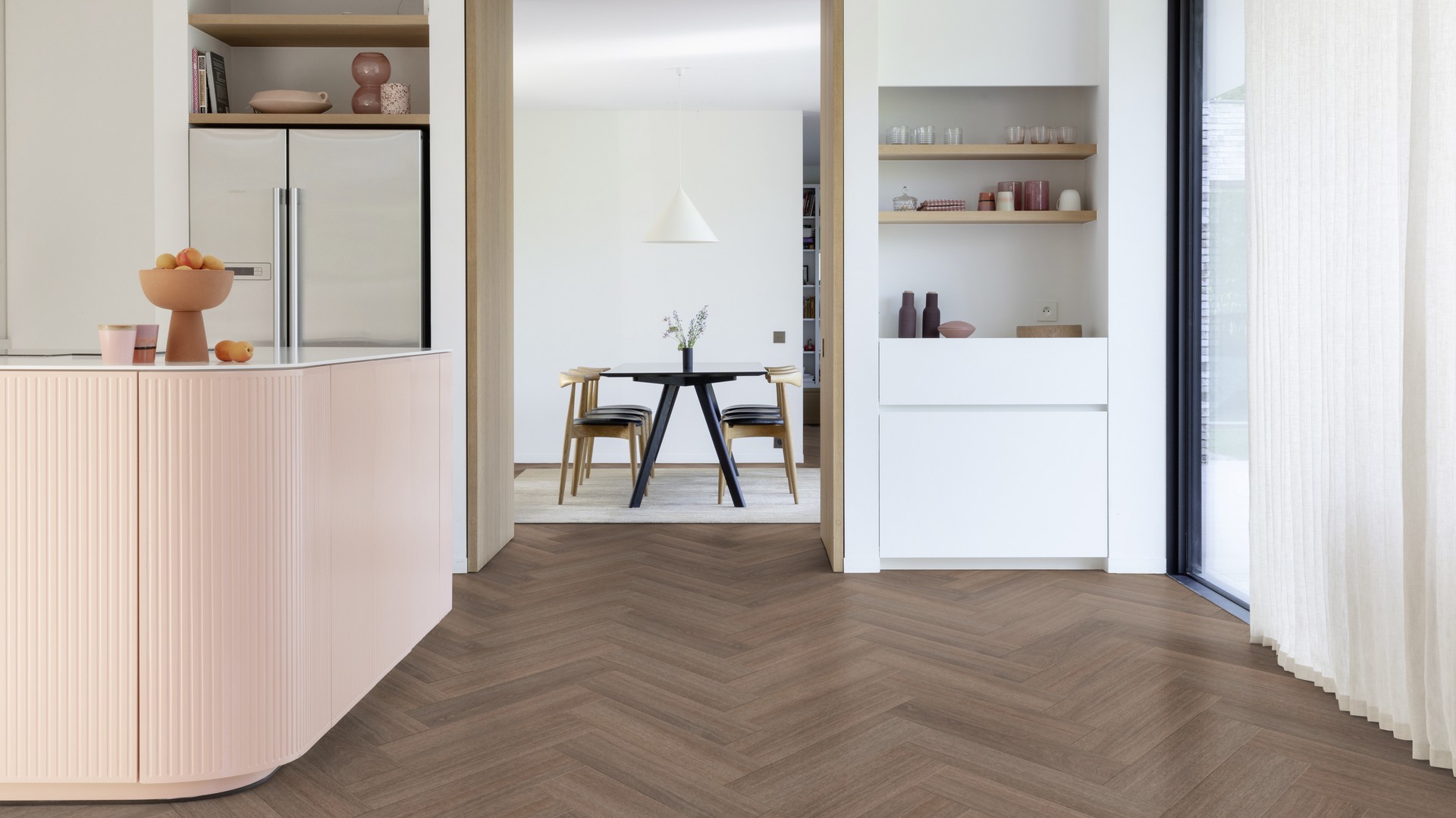 Motyw jodełkowy od lat uznawany jest za symbol ponadczasowej elegancji. W kolekcji Moduleo Roots 55 Herringbone naturalny rysunek drewna został wiernie odwzorowany dzięki realistycznym dekorom, subtelnym przejściom tonalnym oraz strukturze dopasowanej do usłojenia. Efekt wizualny łączy szlachetny wygląd tradycyjnego parkietu z nowoczesną funkcjonalnością winylu, pozwalając tworzyć wnętrza harmonijne i dopracowane w każdym detalu.