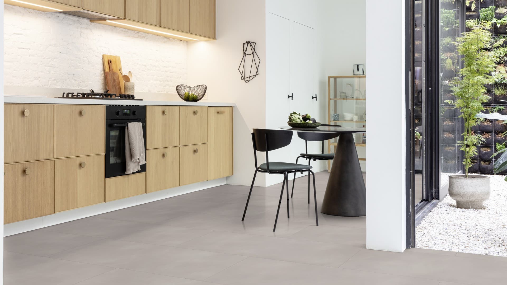 Dekory kamienia i betonu oferują subtelne żyłkowania, matowe powierzchnie i ponadczasowy styl – idealny do kuchni, aneksów, łazienek czy przestrzeni komercyjnych. Format dużych płyt pozwala osiągnąć efekt jednolitej, nowoczesnej posadzki.