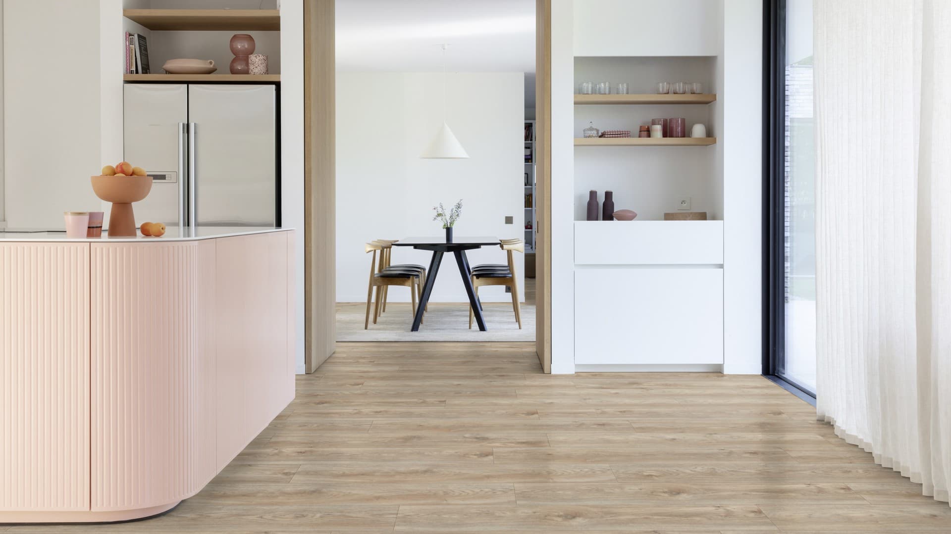 Dekory drewna obejmują eleganckie dęby, orzechy, struktury rustykalne oraz nowoczesne minimalistyczne wykończenia. Struktura embossed-in-register sprawia, że słoje i faktura drewna idealnie odwzorowują naturalny materiał. Dostępne są deski klasyczne, szerokie XL oraz formaty jodełki, co pozwala tworzyć efektowne kompozycje – od klasycznej elegancji po nordycki minimalizm.